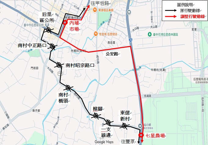 本公司211路公車,於115年4月11日起至115年7月15日止,配合后里區南村路道路施工管制通行,調整行駛動線如下圖所示。欲在「東億新村」、「一支線邊」、「樟腳」、「南村橋頭」、「南村昭宗路口」、「南村中正路口」及「后里區公所」等站上下車乘客,請至鄰近之「七星農場」、「內埔市場」站上下車,不便之處,敬請見諒。
