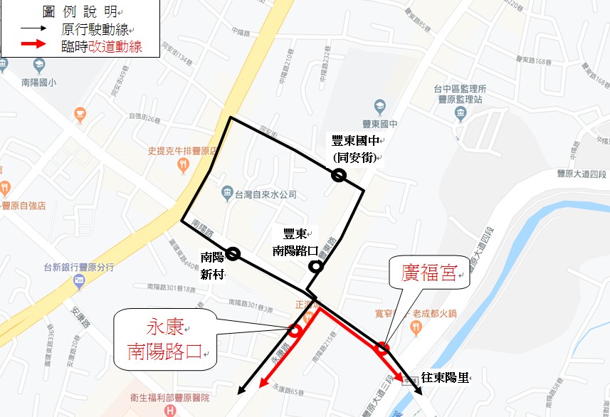 本公司227路公車,於108年8月16日當日(遇雨順延),配合豐原區同安街道路封閉施工,公車改道行駛如下圖所示。 欲在「豐東南陽路口」、「豐東國中(同安街)」、「南陽新村」站上下車乘客,請至「永康南陽路口」或「廣福宮」站上下車,不便之處,敬請見諒。